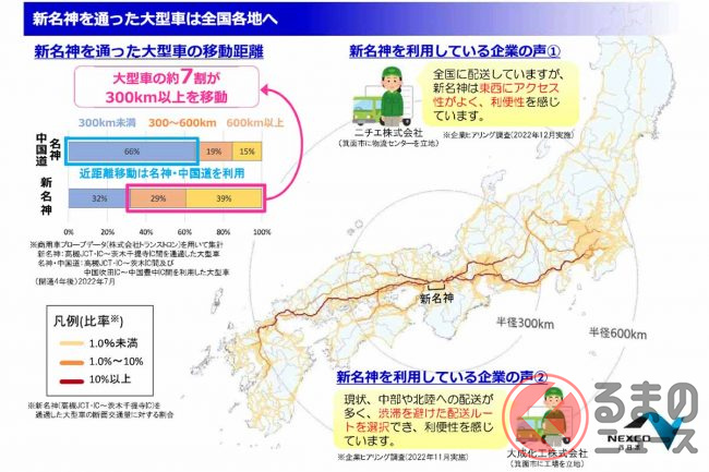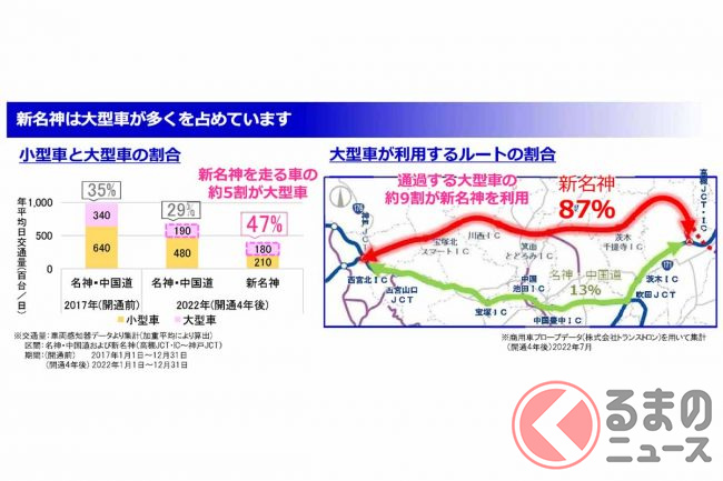 また、高槻~神戸を通過する大型車のおよそ9割は新名神経由を選んでおり、新名神は物流の重要な動脈を担うまでに成長しています。
