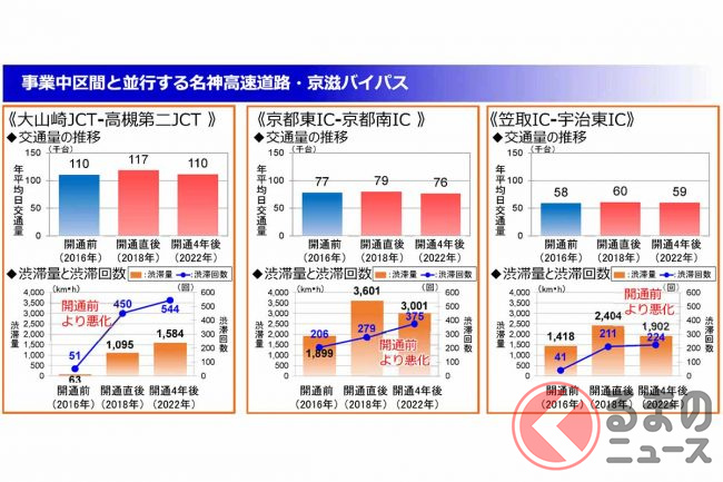 特に京滋バイパスが合流して新名神が分岐するまでの大山崎JCT~高槻JCT・IC間は日平均交通量が10万台以上で、天王山トンネルを中心に最大8車線(片側4車線)が確保されているものの渋滞は悪化。その回数は2016年の51回から2022年は544回と10倍以上に増加しているということです。