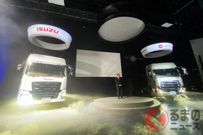 いすゞとUDトラックスが新型トラクタヘッドを初公開! 共同開発モデル「ギガ」&「クオン」お披露目! 今後も協議の深化を継続へ
