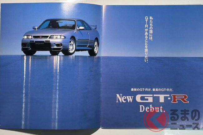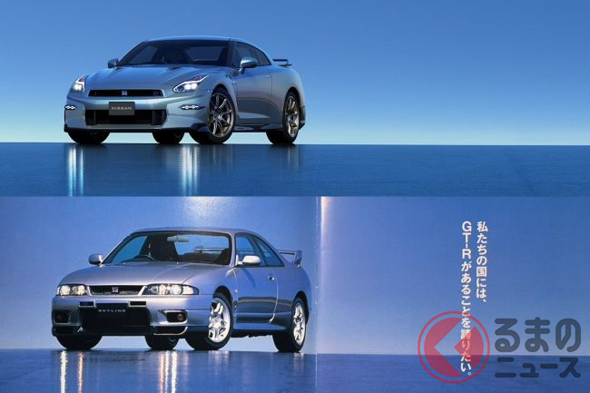 別の写真を見ても同様に「オマージュ」とも捉えられるものがあり、ブルーの背景色にGT-R 2024モデルが配置された写真は、1995年登場のBCNR33型 スカイラインGT-Rのカタログ写真とほぼ同じと言っても過言ではありません。