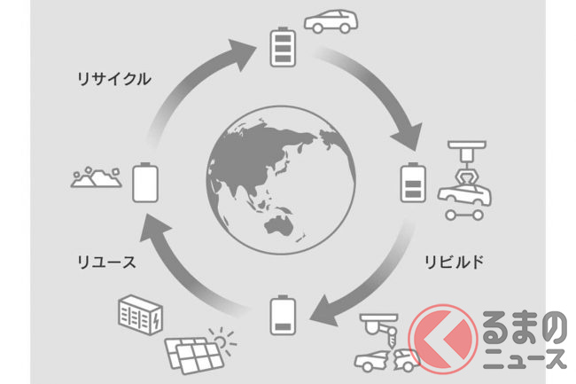 車両に搭載されていたバッテリーを新しいクルマに利用したり、電力貯蔵などの蓄電池として活用。