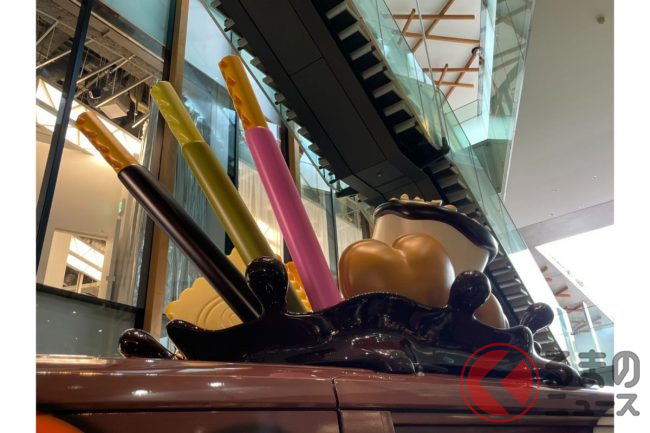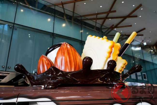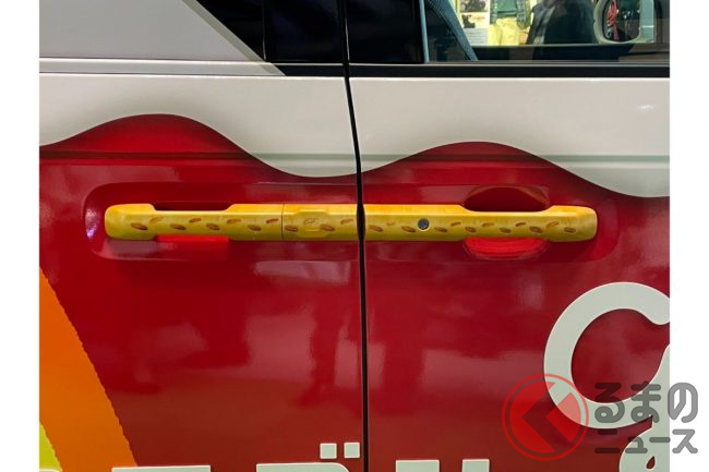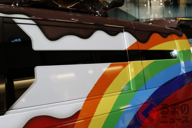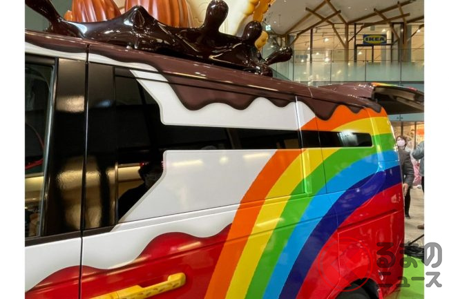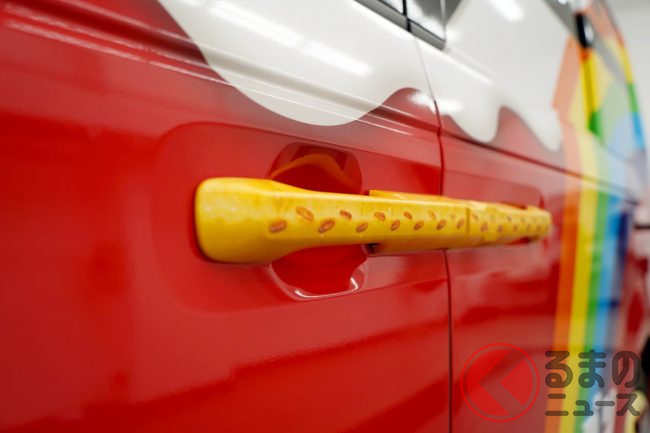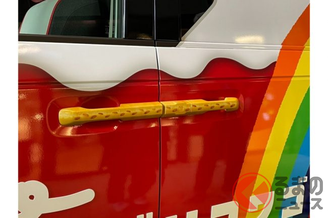 また、車体は先代モデルと同様に、グリコのコーポレートカラーでもある赤を基調としたラッピングです。これをベースに、白いクリームやチョコレートが描かれるほか、ドアハンドルには「プリッツ」、テールライトにはポッキーといったように、あらゆる場所にもお菓子があしらわれています。