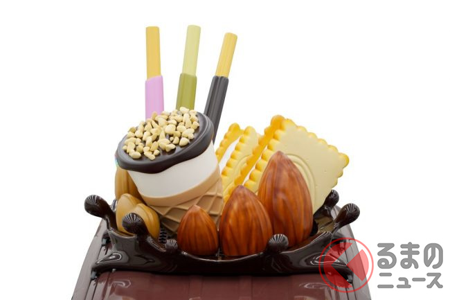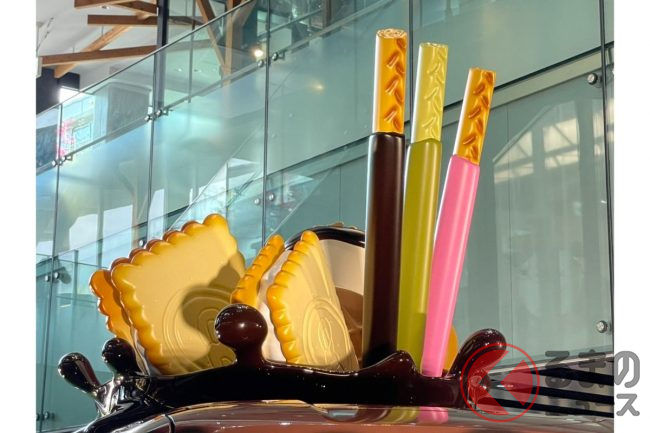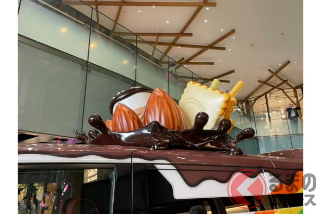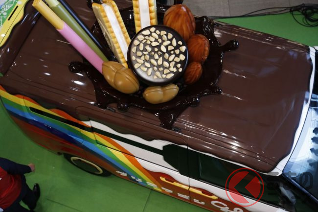 そのエクステリアで最も目を引くのは、ルーフに載せられた「ポッキー」や「ビスコ」、「ジャイアントコーン」といったグリコの代表的な“お菓子”たち。これにより新型グリコワゴンの全高は2.8mにもなるといいます。