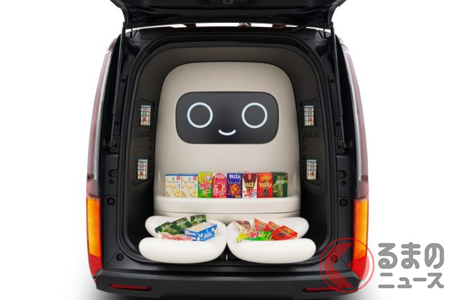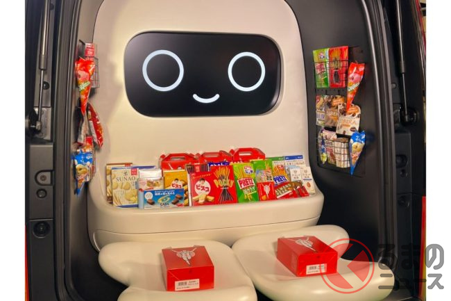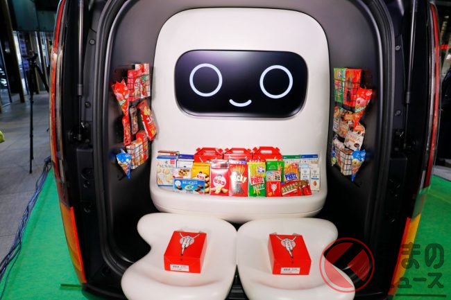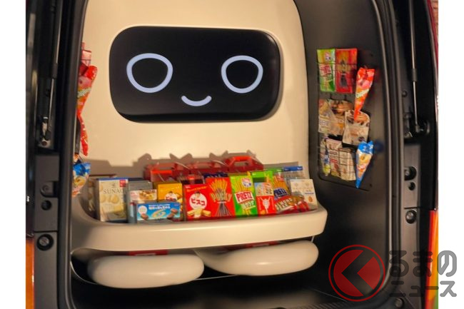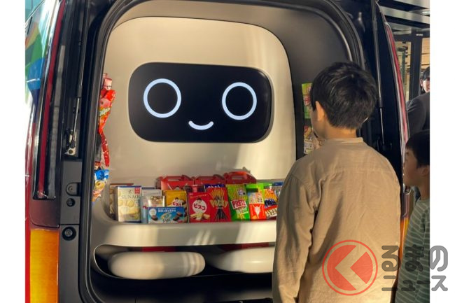 テールゲートをあけると、巨大な“ロボット”のような親しみやすいキャラクターが搭載されているのがわかります。このキャラクターは、子どもたちの会話に反応して表情が変わり、両手で差し出すようにお菓子を渡すことができ、子どもたちと活発なコミュニケーションを生み出すことが可能です。
