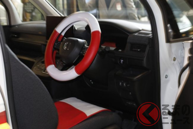 さらにホイールキャップは「プッチンプリン」をイメージしたデザインのものに換装され、フロントフェイス中央には、グリコの「ゴールインマーク」があしらわれます。なお、本来そこにあるホンダエンブレムの内側にはレーダーなどが組み込まれているため、走行中は取り外すとのことです。