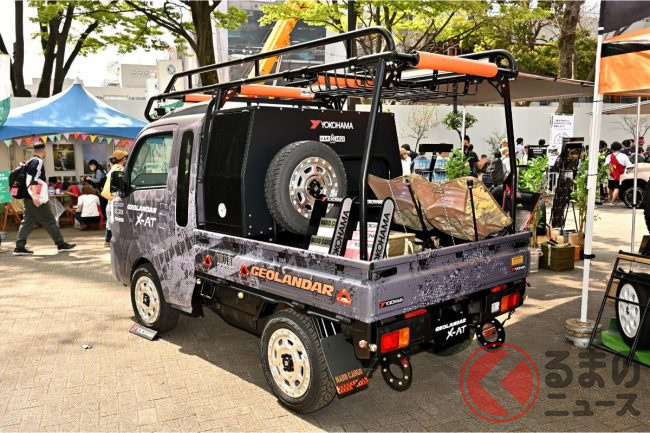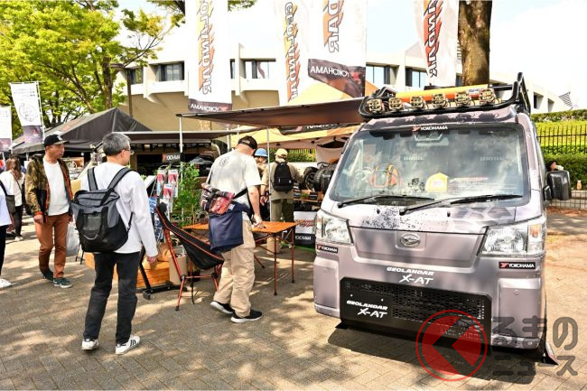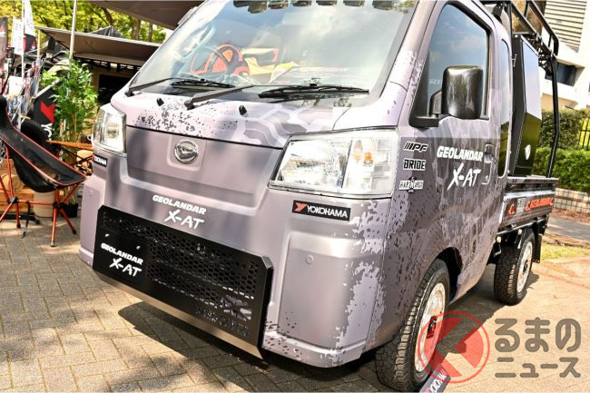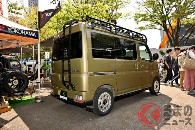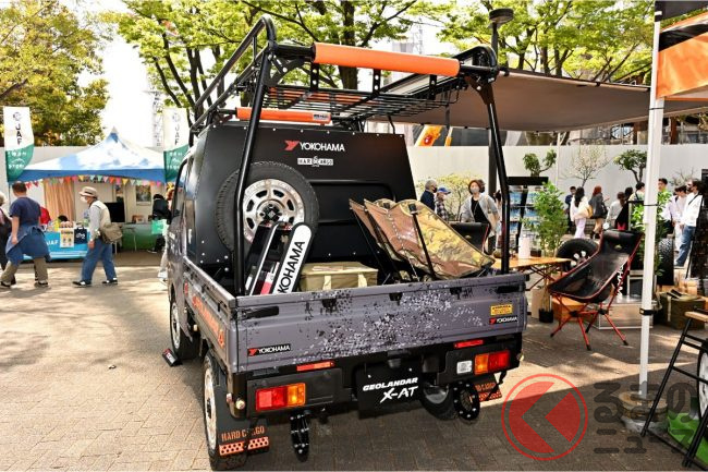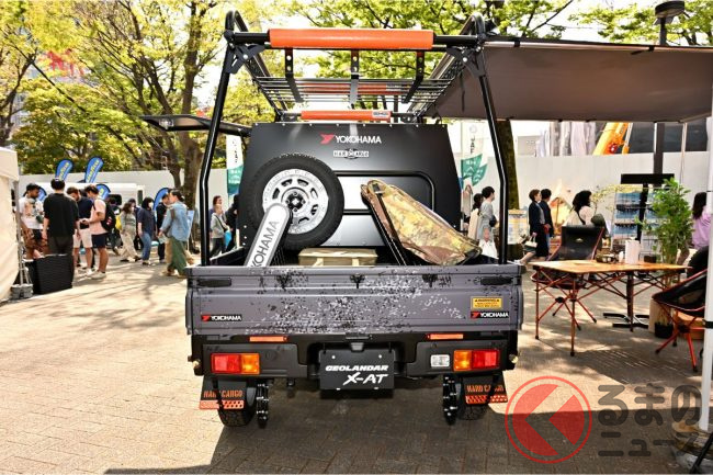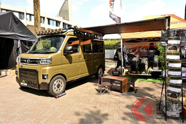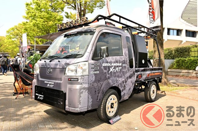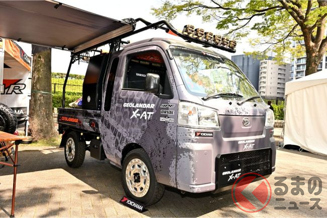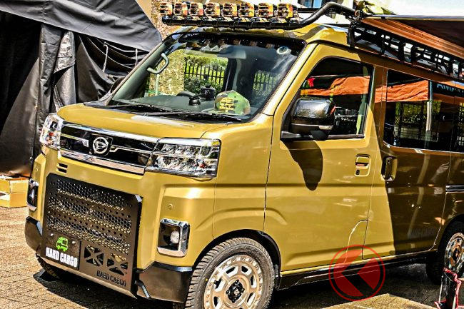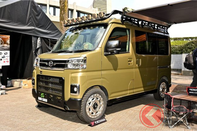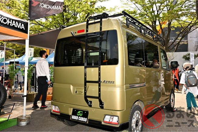 2023年4月1日から2日まで開催された「アウトドアデイジャパン東京」の横浜ゴムが出展したブースでは、カスタムパーツメーカー「ハードカーゴ」のカスタムカーが展示されていました。ダイハツの軽バン「アトレー」と軽トラック「ハイゼットトラック」にSUVのようなタフなテイストをもたせたクルマたちです。