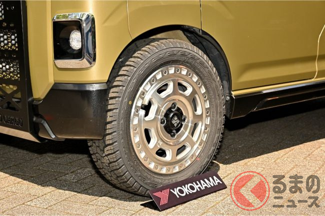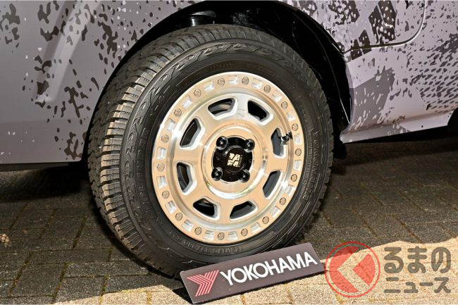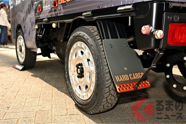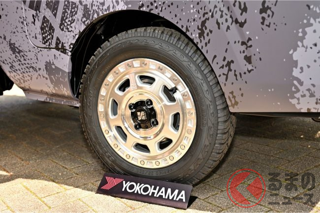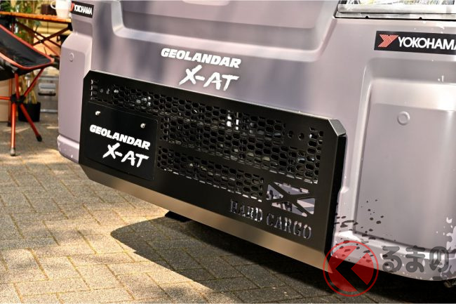 アトレーには、アウトドアキャリア(税込み14万800円)やラダー(税込4万9500円)、スキッドグリル(税込5万3900円)などが装備されるほか、横浜ゴムとハードカーゴがタイアップして制作したという、ホイールハウスにギリギリ干渉しないサイズの大径タイヤに換装され、まるでSUVのようなタフな印象に変化しています。