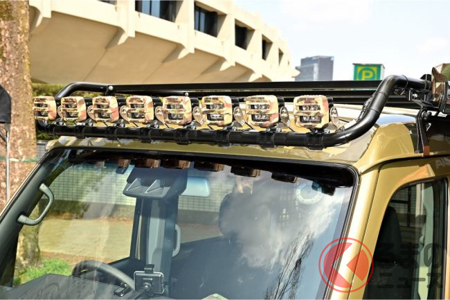 ハイゼットにも、ワークキャリア(税込み14万800円)や、ワークライト(税込1万6390円)、マッドフラップ(税込1万780円)、ボックス(税込15万9500円)、スキッドグリル(税込5万3900円)が装備され、オフロードを駆け抜けるラリーカーのような風体です。