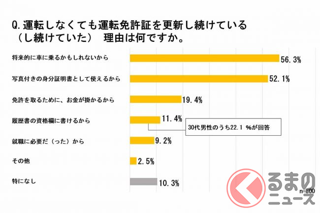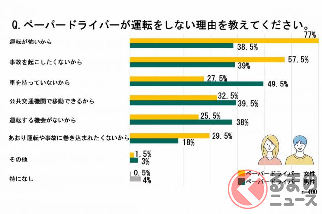 最多だった回答は、男性は「車を持っていないから」が49.5%だった一方、女性は「運転が怖いから」が77.0%でした。