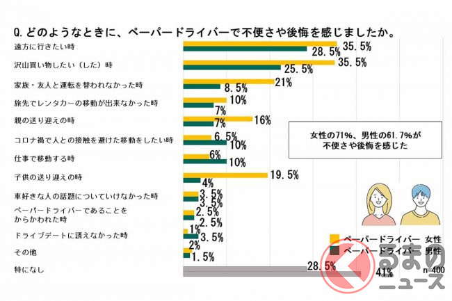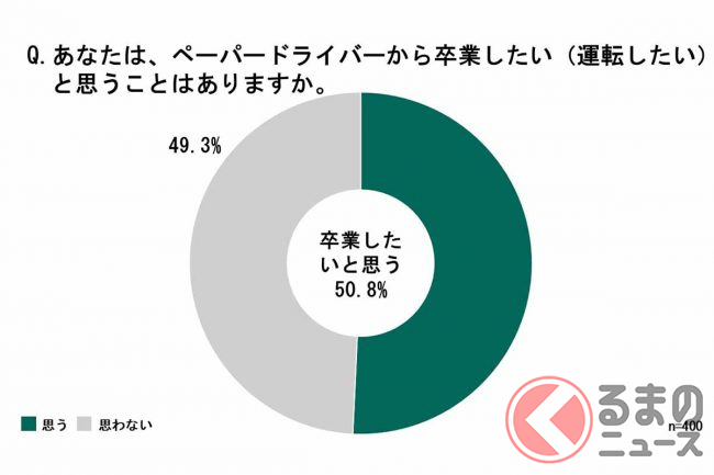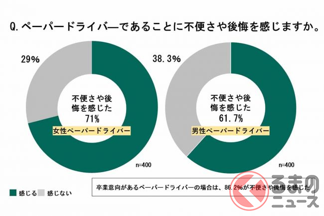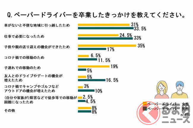 女性は日常的な理由で、男性は非日常的な理由で「ペーパー」を卒業する人が多い傾向にあるようです。