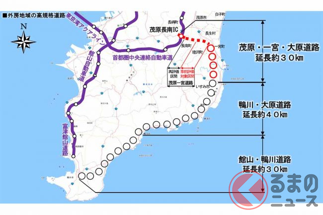 そしてさらにその先も、鴨川市まで「鴨川・大原道路」、館山市まで「館山・鴨川道路」が高規格道路の計画として存在。沿線の各自治体などはこれらの計画の早期実現に向けた取り組みを進めています。