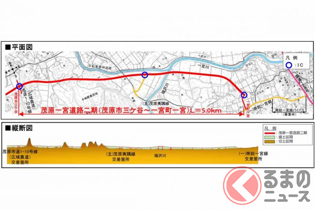 全長12.2kmのうち、現在は茂原長南ICの前後2.2kmのみが開通。そして2023年度には、現在の終点の長南町坂本から茂原市台田(県道27号茂原大多喜線)までの2.5kmが延びる予定です。