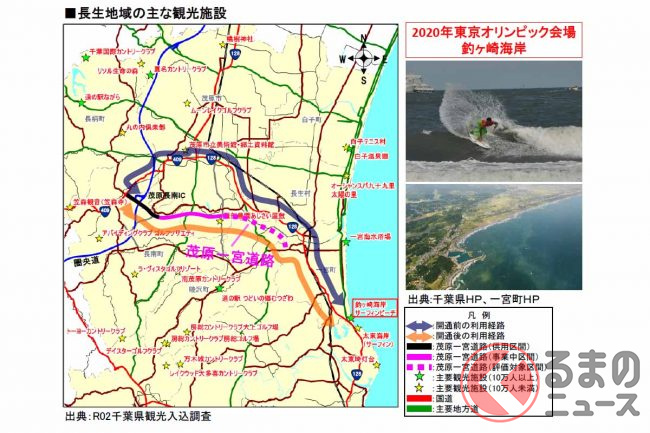 九十九里浜の南端に位置する釣ヶ崎海岸は“サーフィンの聖地”として知られており、2013年の圏央道開通後、訪問客も増加傾向といいます。2021年の東京五輪ではサーフィンの競技会場にもなりました。県は道路整備によりアクセス性が向上し、観光振興にも寄与すると見込みます。
