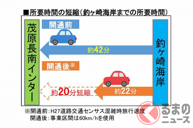 一宮町まで開通すると、茂原長南ICから釣ヶ崎海岸(一宮町)までの所要時間は現在の半分ほどの約22分に短縮するといいます。