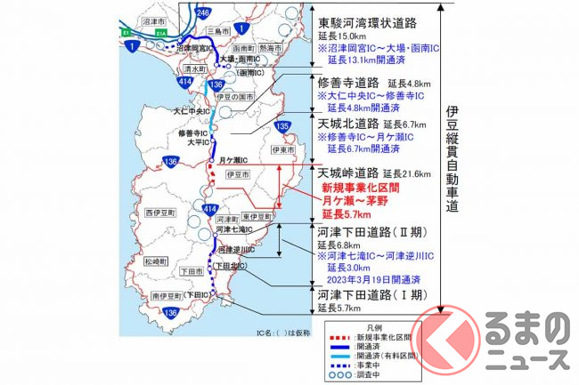国土交通省中部地方整備局沼津河川国道事務所は2023年3月、伊豆縦貫道の「天城峠道路(月ケ瀬~茅野)」の区間について、新規事業化すると発表しました。