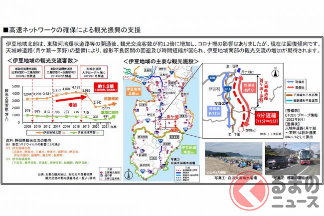 伊豆縦貫道が茅野ICまで延伸することで、現道(国道414号)の急カーブ箇所などが回避でき、所要時間も短縮。観光スポットである浄蓮の滝へのアクセス性も向上します。