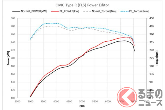 「パワーエディター」を装着することで、最高出力は6650rpm時の243.3kW(330.7PS)から6610rpm時の251.2kW(341.5PS)へ、最大トルクは3970rpm時の406.1Nm(41.4kgf・m)から4010rpm時の420.5Nm(42.9kgf・m)へとパワーアップし、HKSによると「3500~6500rpmにてアドバンテージが得られ、より気持ちよい加速感が得られる」(資料より)とのことです。