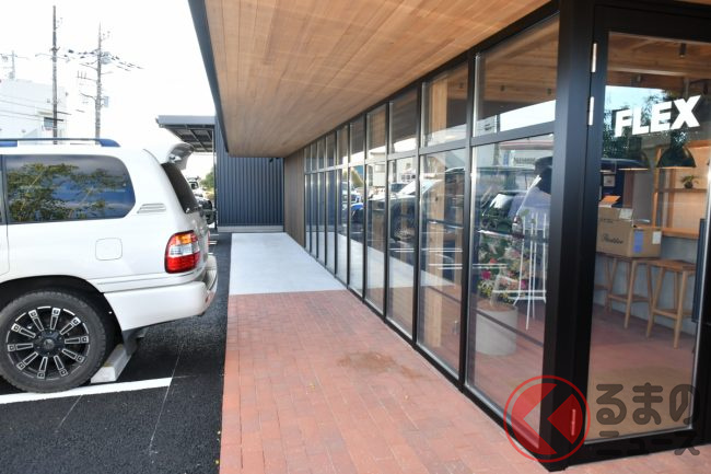 今回新たにランクル専門店をオープンさせたのは、ランドクルーザーやハイエースの専門店を全国で展開しているFLEXで、上質な中古車の目利きやカスタマイズ、メンテナンスの知識は折り紙つき。そして新店舗の外観はオシャレなカフェを思わせるスタイルで、フラッと立ち寄りたくなる敷居の低い雰囲気を纏っているのです。