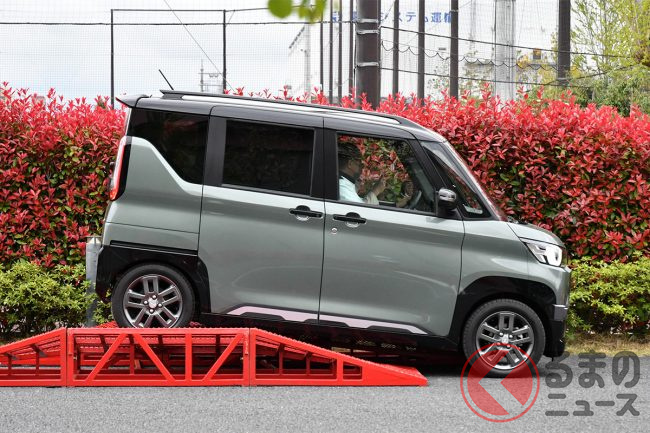 ただ新型デリカミニ自体が持つ能力なら、この程度の傾きでは余裕があるといいます。三菱によれば、メーカー届け出数値による「横転角度」は42~43度(グレードにより異なる)とのことで、試乗コースはまだ半分弱の数値だとわかります。