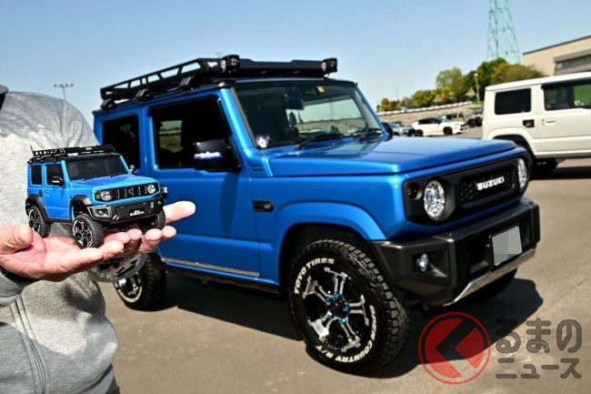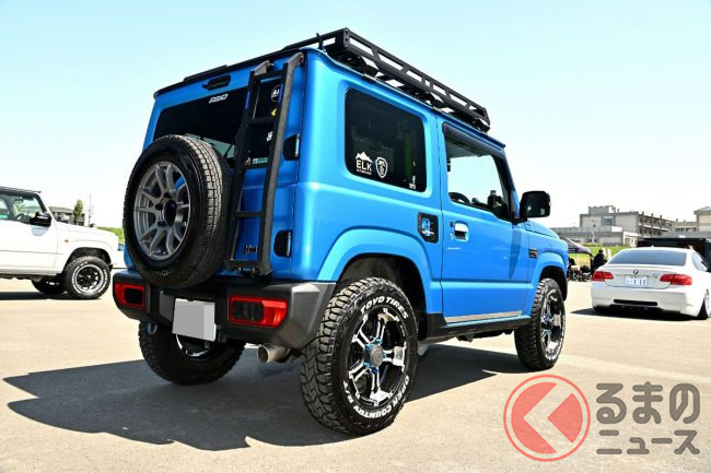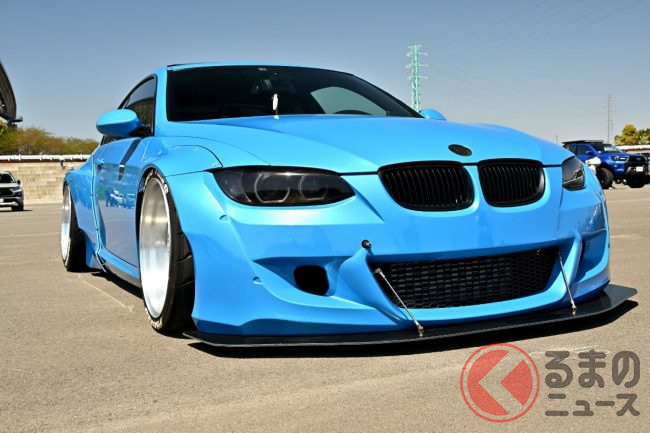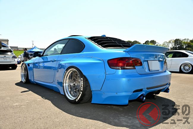 爽やかなブルーが鮮やかですが、なんとホンダFIT純正色だそうで、パンデム製のワイドフェンダーが装着されていて迫力満点です。しかもフェンダー装着やオールペンをDIYで行ったといいます。