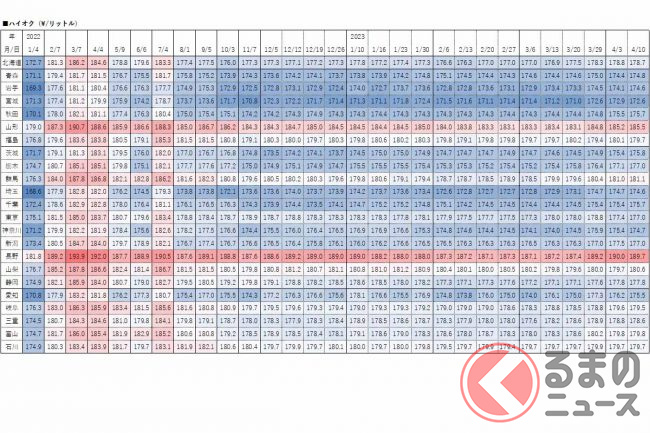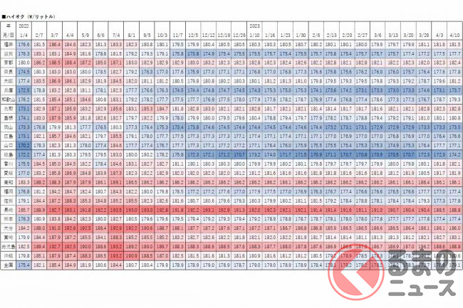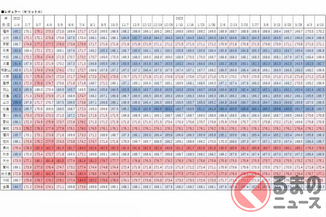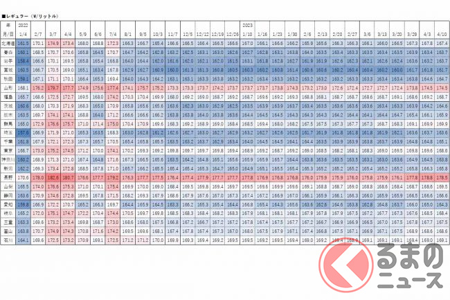 経済産業省資源エネルギー庁は2023年4月12日、レギュラーガソリンの10日時点の店頭小売価格(消費税込)を発表しました。