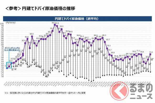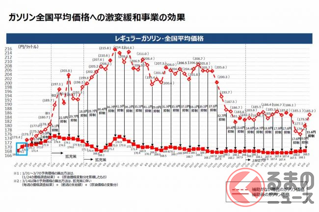 ガソリン価格の高騰を受け、政府は石油元売り企業に補助金を出す価格抑制策を実施。ガソリン、軽油、灯油、重油を対象に2022年1月から1リットルあたり5円、3月から25円、4月から35円を上限に支給しており、さらにそれでもガソリン1リットルの平均価格が170円(4月25日週以降は168円程度)を超過したら、その半分を支援すると発表しています。