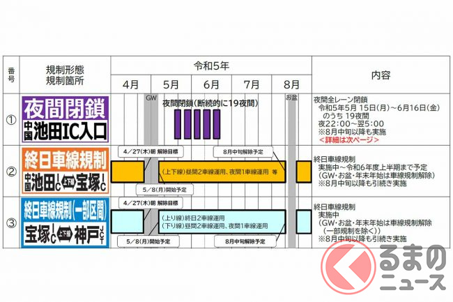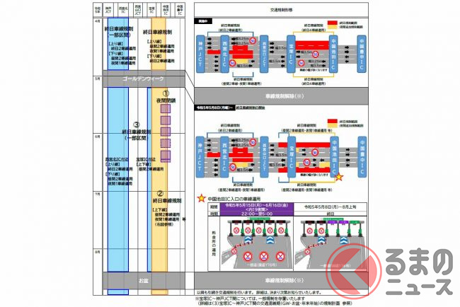 NEXCO西日本関西支社が、2023年5月から8月にかけて中国道の吹田JCT~神戸JCT間で計画している交通規制の日程を発表しました。