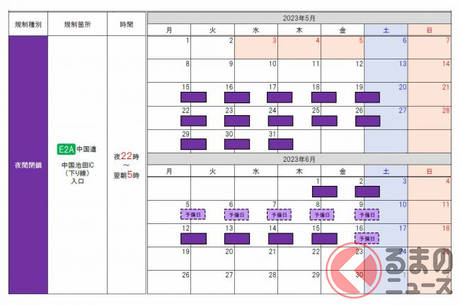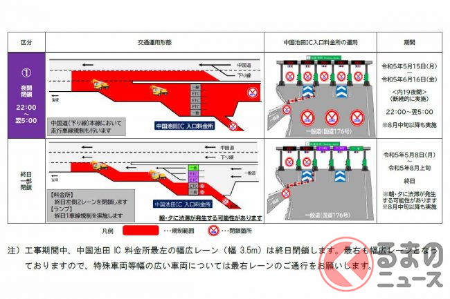 平日19夜間、入口の全レーンが閉鎖されます。時間は平日夜22時から翌5時まで。実施日は5月15日~19日、22日~26日、29日~6月2日、12日~15日です。なお、予備日として6月5日~9日と16日が確保されています。