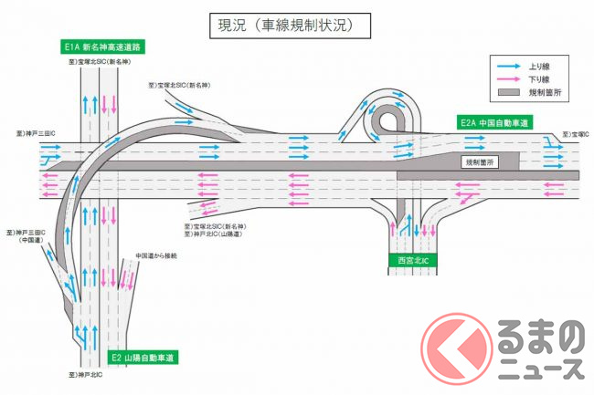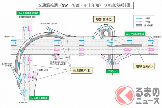 また、ゴールデンウィークなどの混雑期も、上り西宮北IC付近では規制がすべて解除されず、通行帯が3車線となります。