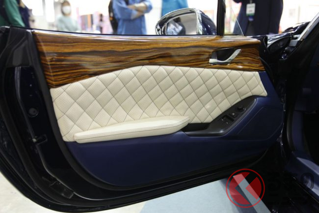インテリアはロードスターの雰囲気がところどころに感じられるものの、各所にウッドパネルを採用するほか、パーフォレーテッドレザーをシートや内装材に使用し高級感を演出。これらのシートなどもすべてハンドメイドでできており、ウッドパネルも本木目を採用。