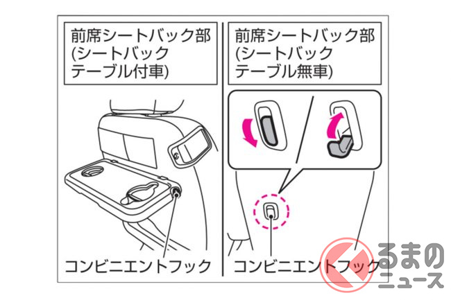 2023年4月6日に正式発表し、5月25日に発売を予定する三菱自動車工業(以下、三菱)の新型軽スーパーハイトワゴン「デリカミニ」では、助手席前のインパネと、後席のシートバックテーブルにそれぞれコンビニフック(三菱での名称は「コンビニエントフック」)が備わっています。