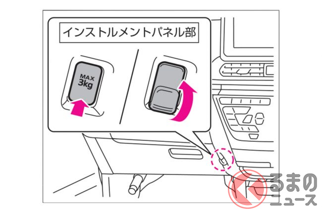 新型デリカミニの場合、助手席前のコンビニフックが収納された際の表面に「MAX3kg」との記載もあり、使用前に注意を促しています。