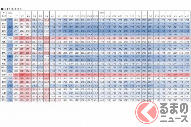 一方、最も高かったのは長野県で178.5円、次いで長崎県178.3円、鹿児島県176.8円でした。