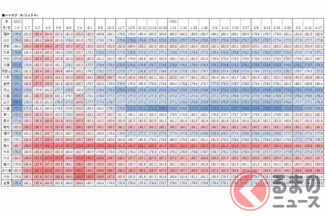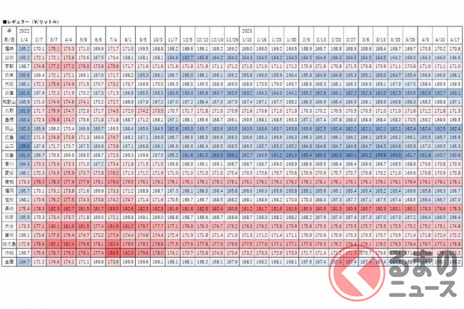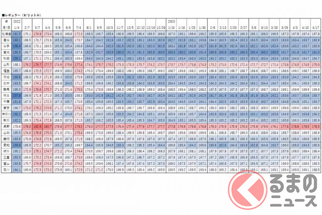 経済産業省資源エネルギー庁は2023年4月19日、レギュラーガソリンの17日時点の店頭小売価格(消費税込)を発表しました。