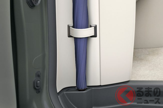 さらに、4人乗り仕様のBピラー付近を見てみると、スライドドアを開けた状態でパーティションの壁面部に傘が収納できるホルダーが設けられているようです。