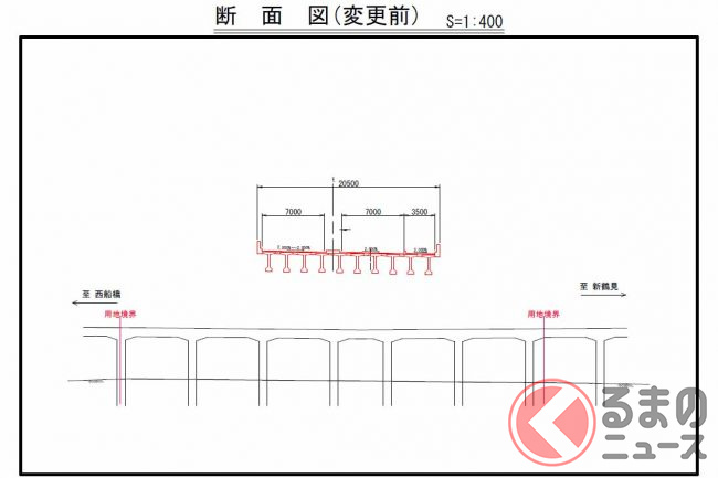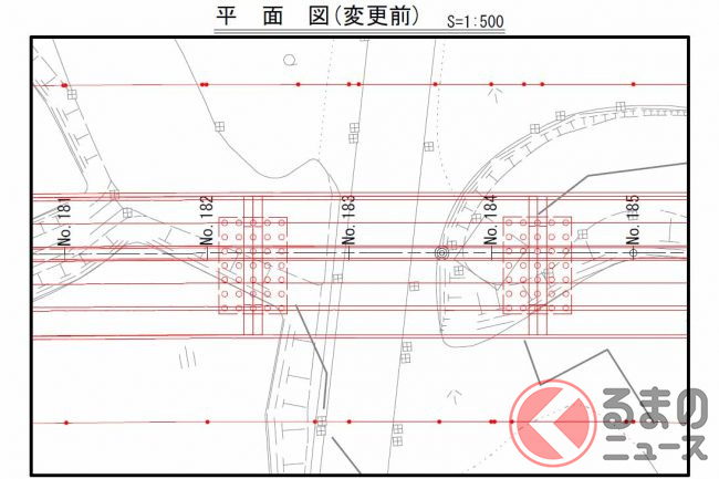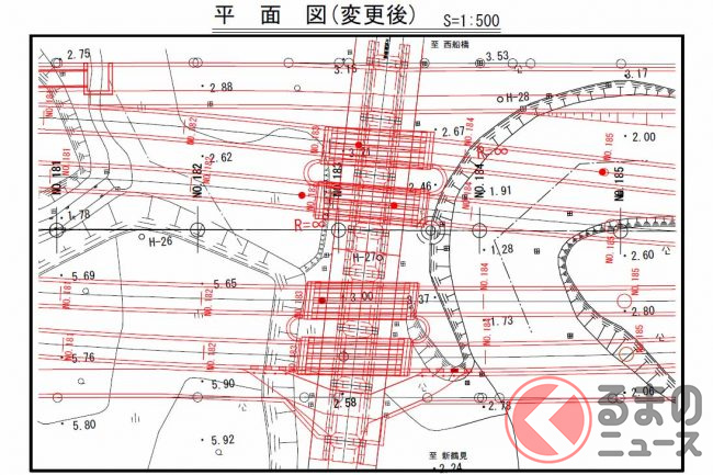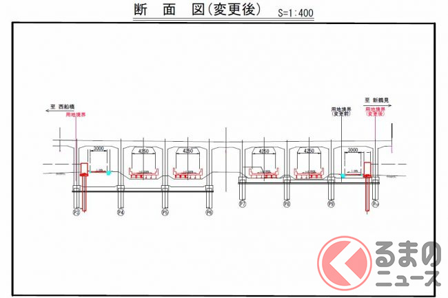 元の計画は、道路が高架の線路の上をさらに高架でまたぐものでしたが、変更後は、道路の高架をやめて線路の橋脚の間を1車線ずつ分かれてくぐる形になっています。