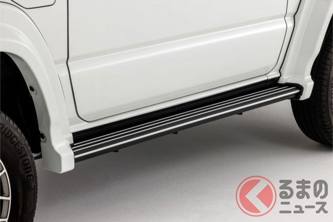 サイドでは、通常のジムニーシエラと比べ質感を大幅に上げる塗装済オーバーフェンダーや、サイドステップが取り付けられます。