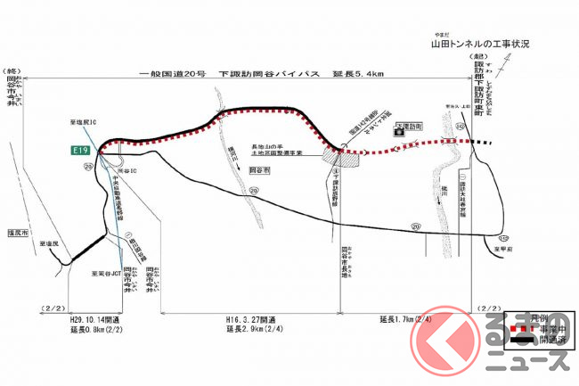 接続する国道20号下諏訪岡谷バイパス(事業中)と諏訪バイパスのこの区間が開通すると、長野道の岡谷ICから諏訪市中心部にかけて、市街地を避けたルートが形成されます。