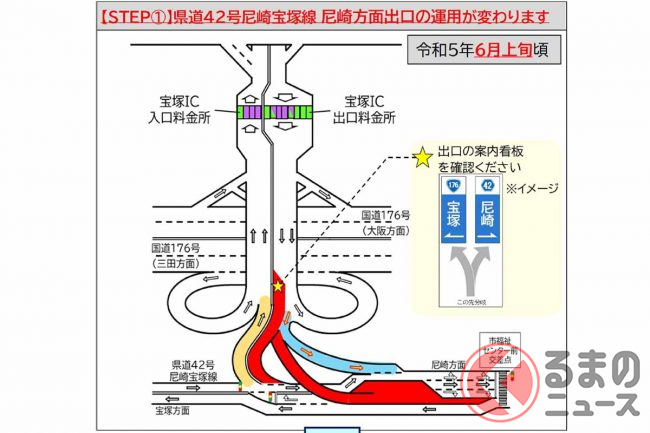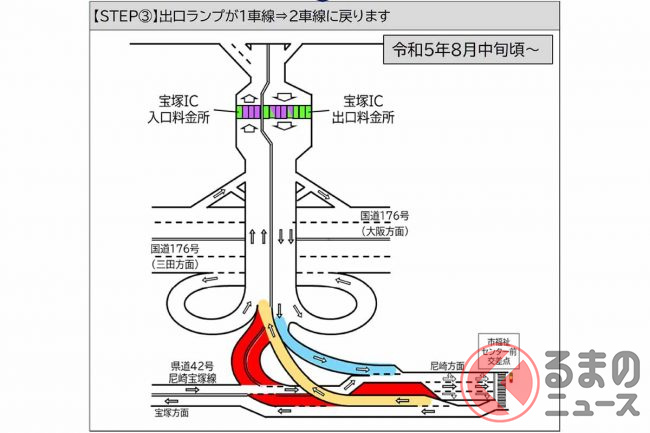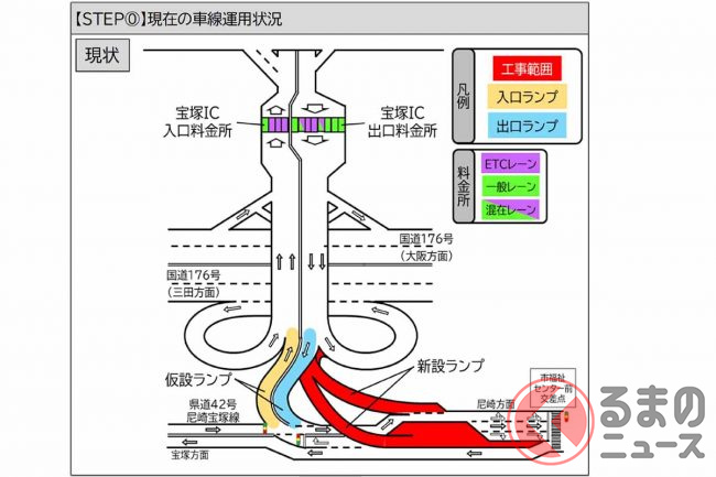 NEXCO西日本関西支社と兵庫県阪神北県民局宝塚土木事務所は2023年4月25日、中国道・宝塚IC(兵庫県宝塚市)のランプ立体交差化に伴い、6月から車線運用を複数回切り替えると発表しました。