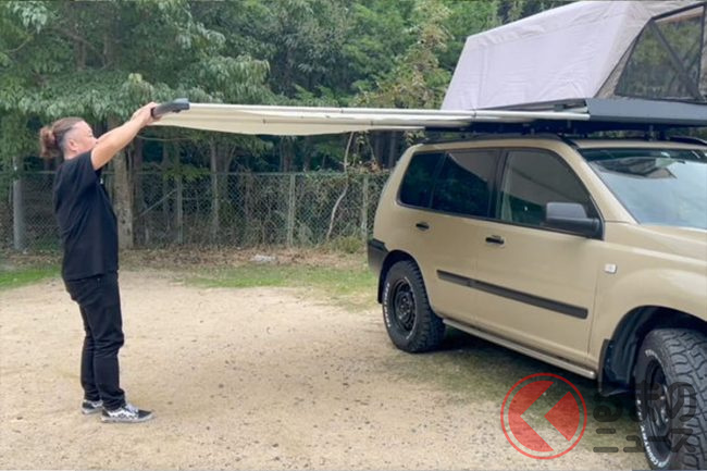 通常のルーフラックは積載する機能しか備えておらず、目的によって別途アイテムを積載する必要がありますが、タイニーハイドアウトであれば「積載+ルーフテント+サイドオーニング+ラダー」という、アウトドアで活躍する4つの機能を最初から搭載しており、とくにサイドオーニングをラック内に搭載した商品は、日本国内では初めてだとFULLFUNZは説明しています。