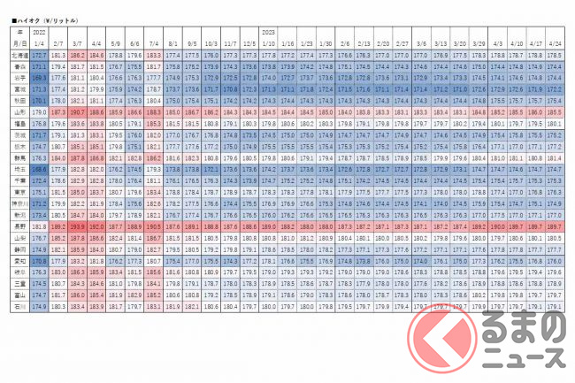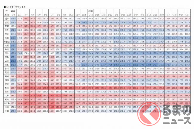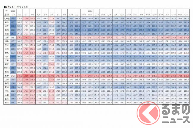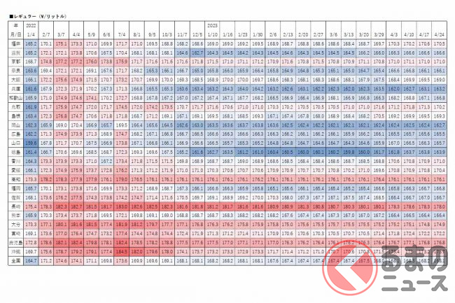 経済産業省資源エネルギー庁は2023年4月26日、レギュラーガソリンの24日時点の店頭小売価格(消費税込)を発表しました。
