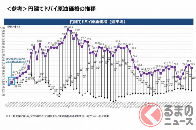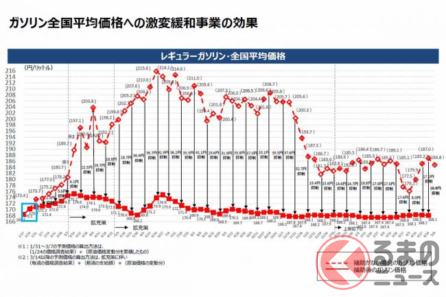 ガソリン価格の高騰を受け、政府は石油元売り企業に補助金を出す価格抑制策を実施。ガソリン、軽油、灯油、重油を対象に2022年1月から1リットルあたり5円、3月から25円、4月から35円を上限に支給しており、さらにそれでもガソリン1リットルの平均価格が170円(4月25日週以降は168円程度)を超過したら、その半分を支援すると発表しています。