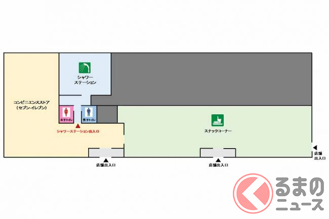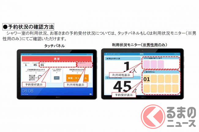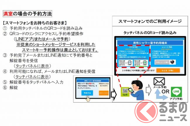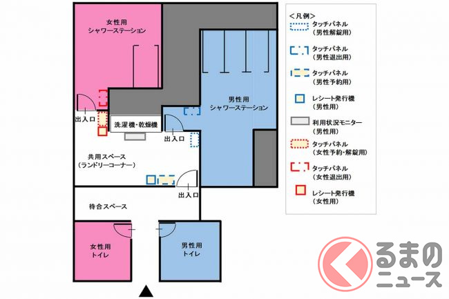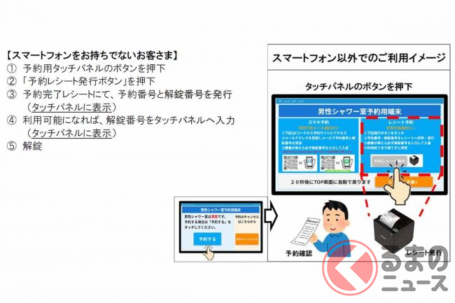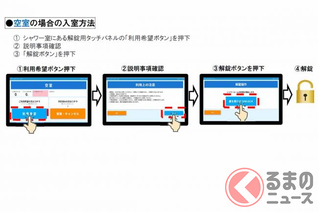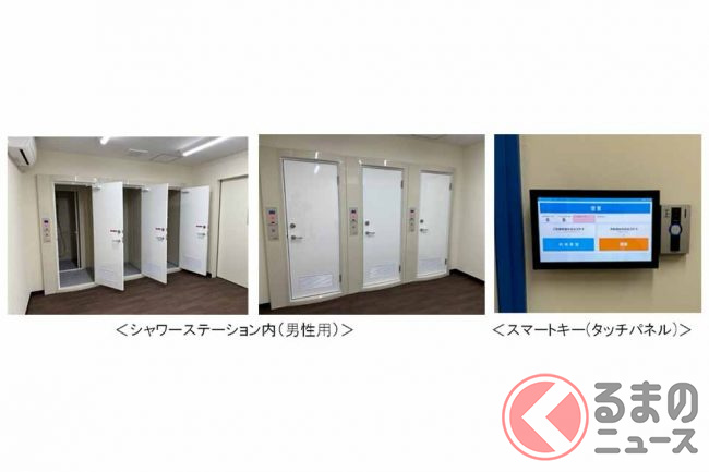 今回新たに営業を始めるシャワーステーションは、上下線とも男性用3室・女性用1室で、24時間営業、10分間300円です。人の手を介さずに入退室できるスマートキーが導入され、満室時は予約機能も使えます。