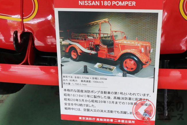 その後、1945年5月に高輪消防署(現:二本榎出張所)に配置。東京オリンピックが開催された1964年10月まで現場で活躍しましたが、以降は広報車両の1台として高輪消防署二本榎出張所で展示されてきた経緯を持ちます。