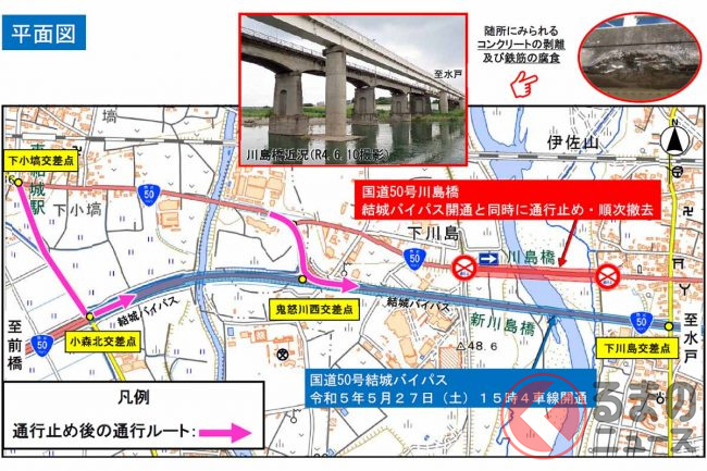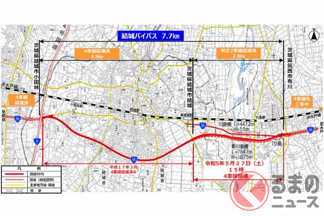 国道50号結城バイパスが、2023年5月27日に全線4車線で開通。そしてこれに合わせて従来の川島橋が閉鎖されます。