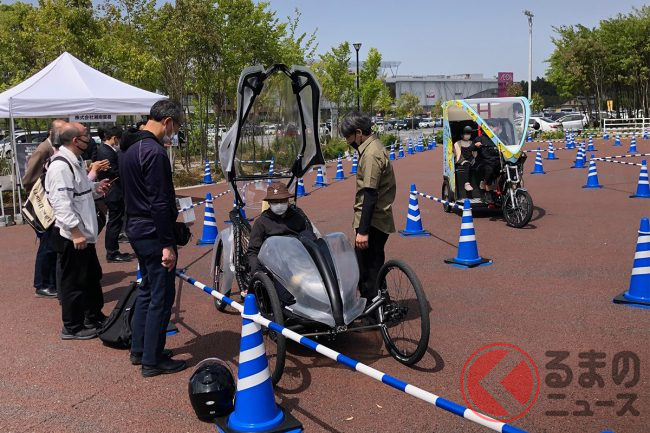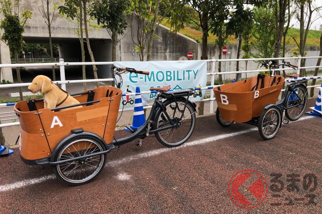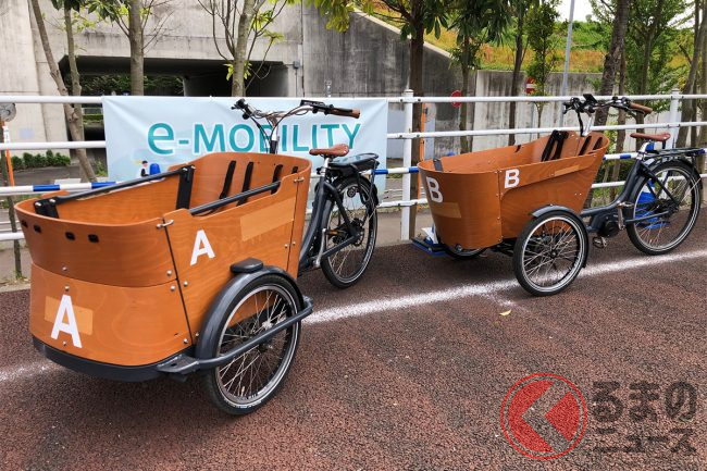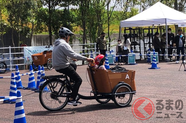 今回のイベントでは、欧州で普及している車体前部に大きな荷室をもつ電動アシスト三輪車など、日本ではあまり目にしない、人力を主な動力とするモビリティを来場者が気軽に試乗することができました。