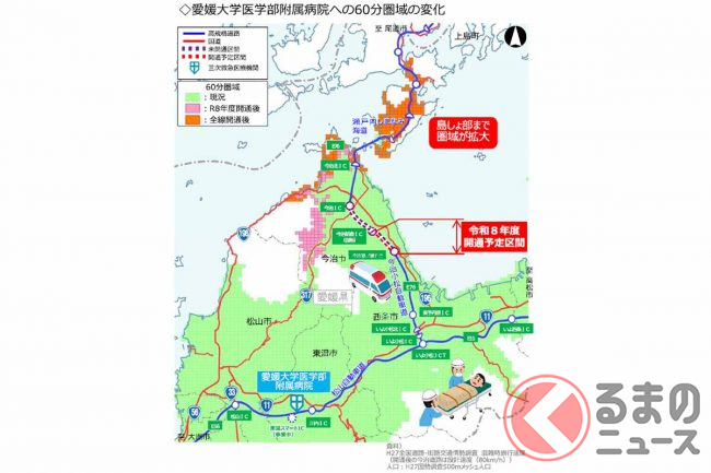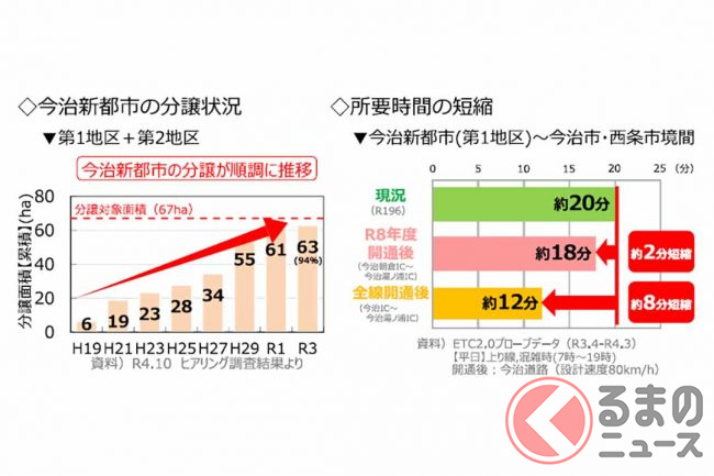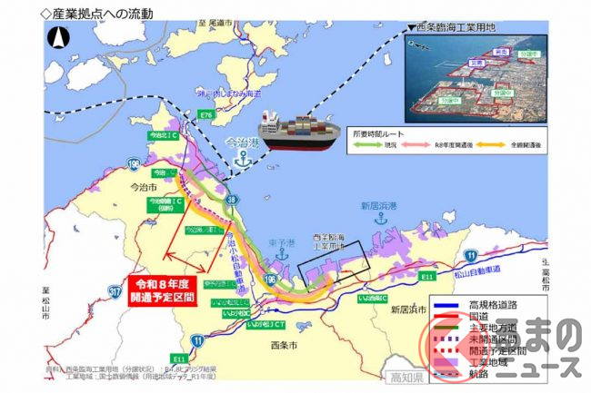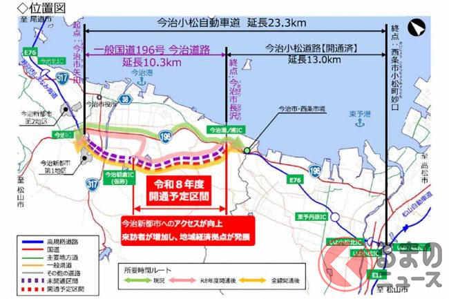 松山河川国道事務所は、今治小松道の延伸により、地域産業のさらなる活性化や来訪者増加による今治新都市(地域経済拠点)の発展、救急搬送時間の短縮などが期待されるとしています。
