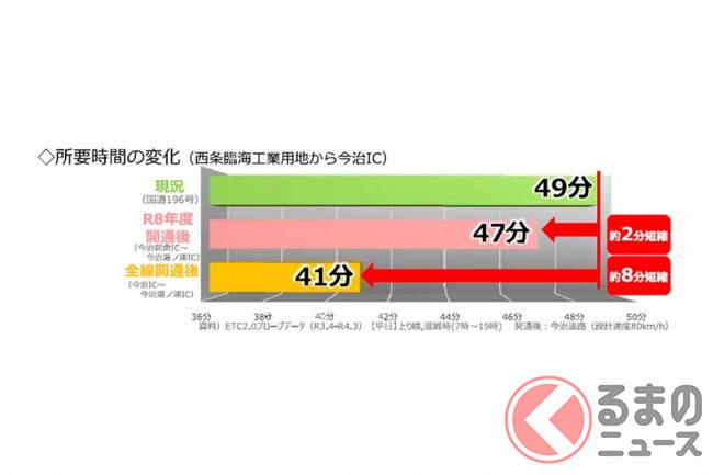 この区間が開通すると、松山道~しまなみ海道間の所要時間は現在の国道経由より約2分短縮される見込みです。ちなみに今治小松道の全線が開通すると現在より約8分短くなるとみられています。