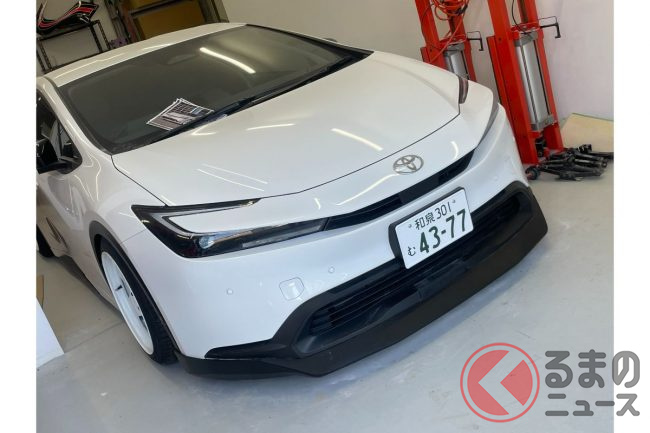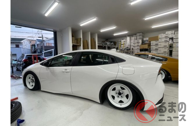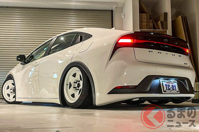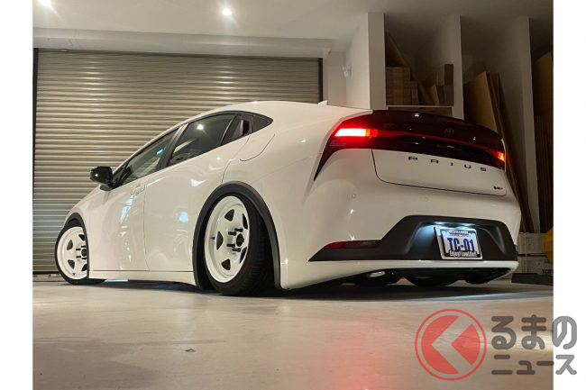 ド迫力! トヨタ新型「プリウス」を早速“超”シャコタン化! ネオレトロな鉄チンも装備! 再生回数100万超の”ヤンチャな1台”とは