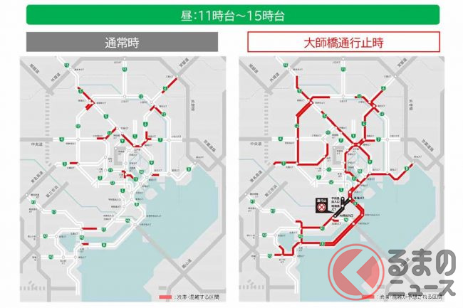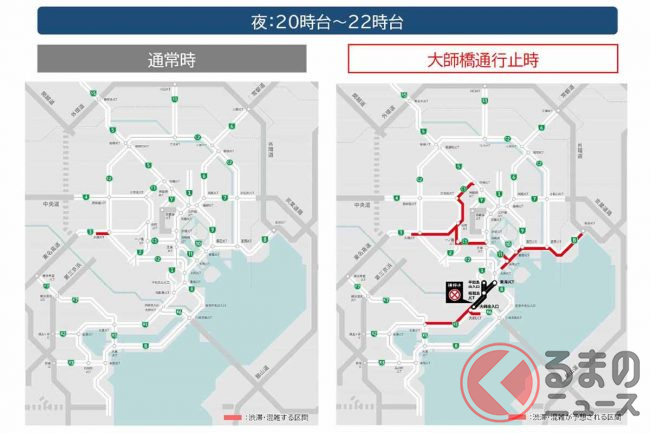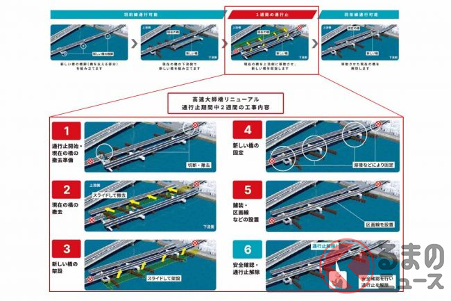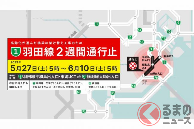 橋の架け替え工事に伴い、首都高速1号羽田線が2週間にわたり終日通行止めに。これにより周辺だけでなく首都高全線で通常以上の混雑が予測されています。